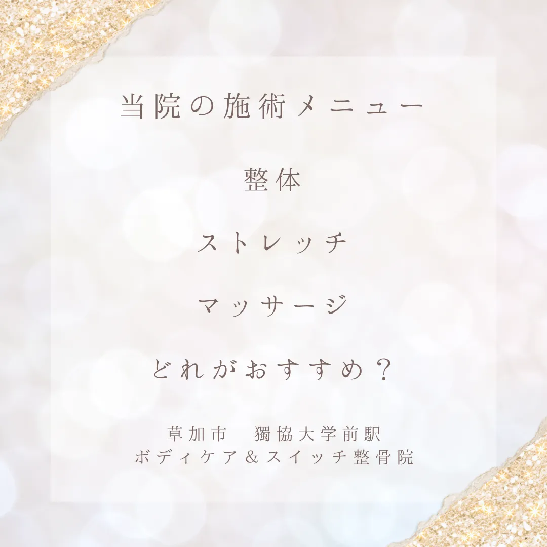 草加市の獨協大学前駅から徒歩5分のボディケア&スイッチ整骨院は、肩こりや首こりの痛みなどの慢性的な不調に対して骨格矯正を主体にした整体施術をご提供することで、根本原因から改善へと導く接骨院です。 当院は、患者様の話をしっかりお伺いしてから施術に入りますので、安心して施術を受けることができます。 また、痛みのある部分だけでなくその痛みがどのような原因で起きているのかを調べ、体全体のことを考えてオーダーメイドでの施術をご提供しております。 草加市近くのマッサージができる接骨院をお探しの際は是非、ボディケア&スイッチ整骨院をご利用下さい。 ボディケア&スイッチ整骨院 所在地:埼玉県草加市栄町2-7-23 最寄駅:獨協大学前駅