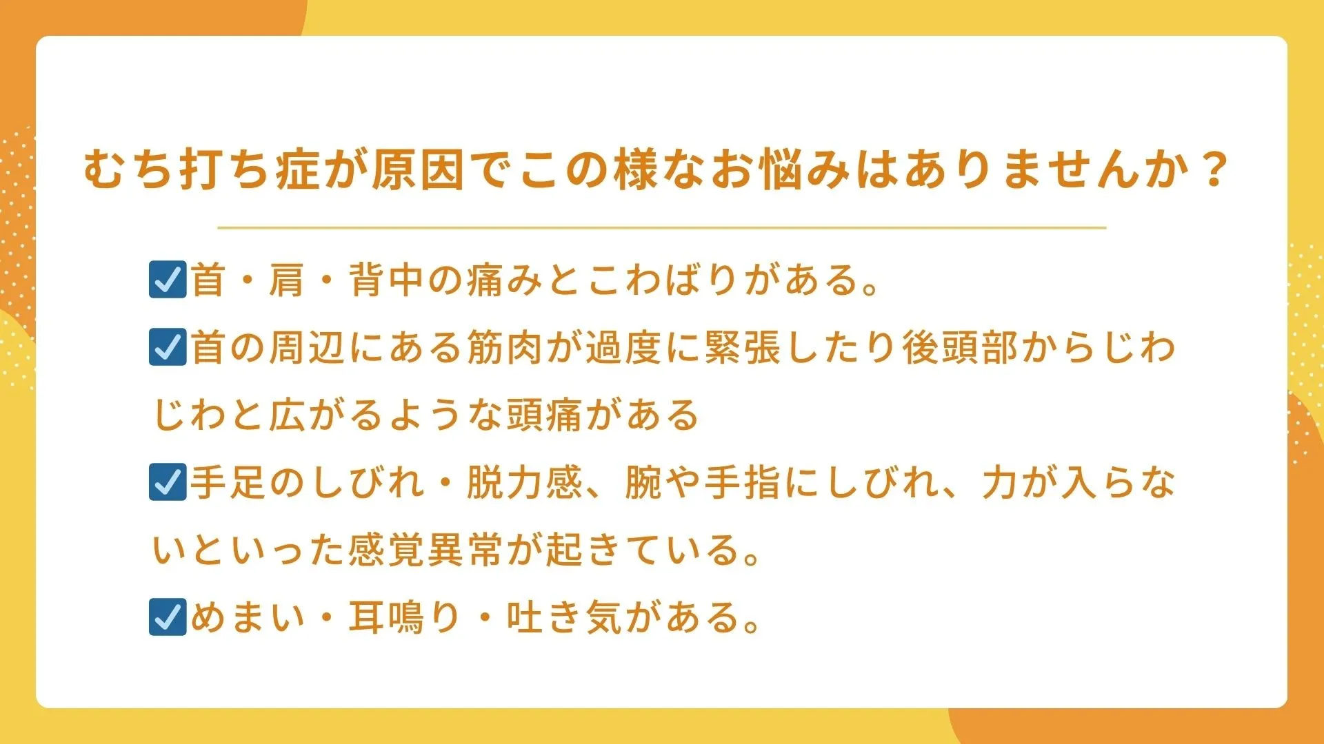 むち打ちの厄介なところは、「事故直後よりも、数日〜1週間ほど経ってから症状が強く出る」ことが多い点です。以下のような症状に心当たりはありませんか?